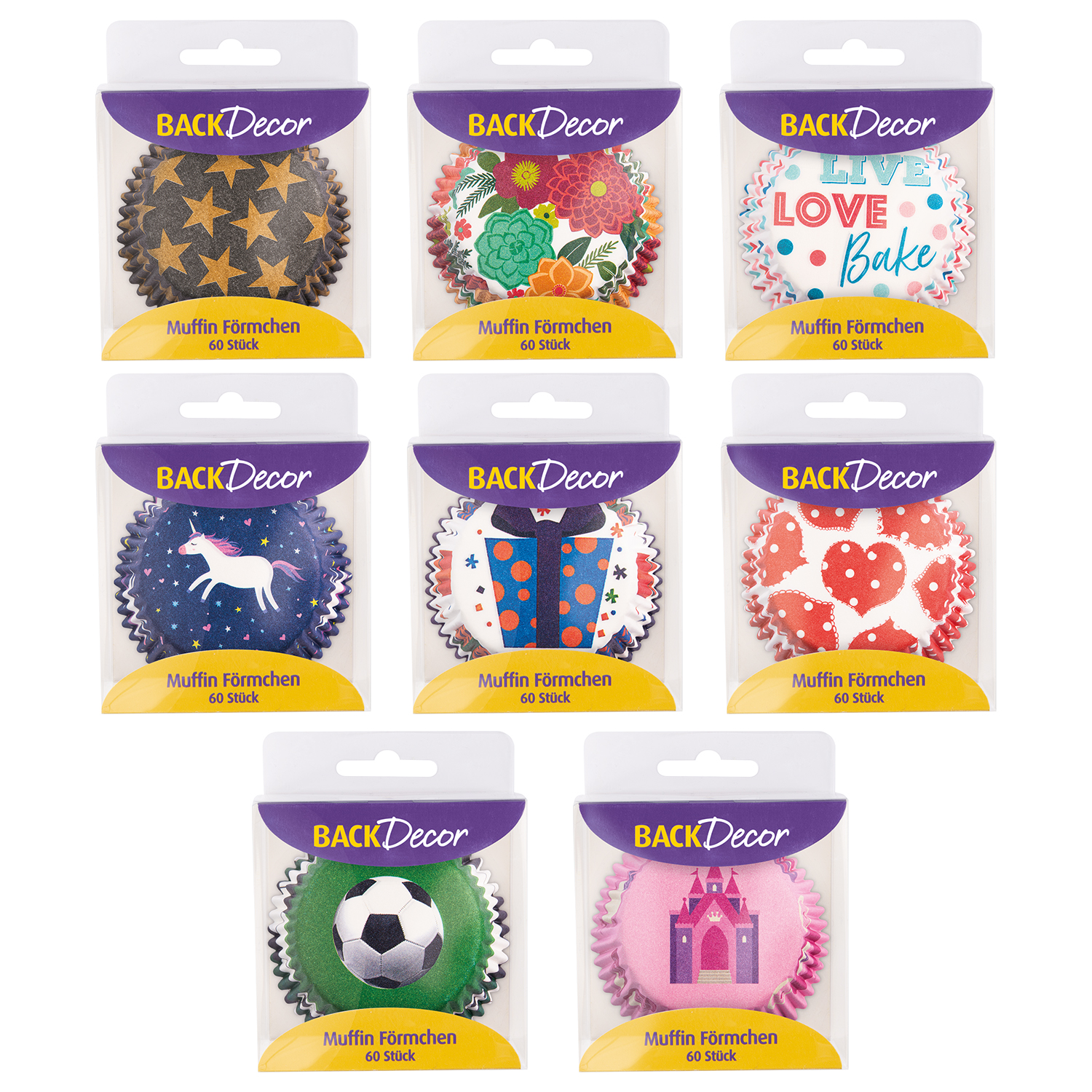 Muffinförmchen mit unterschiedlichen Mustern. Mit dabei sind die Motive: Punkte, Herzen, Karos, Marienkäfer, Zebra, Leo, Fussball und Märchenschloß. Bestens für selbstgemachte Muffins und Cupcakes geeignet.