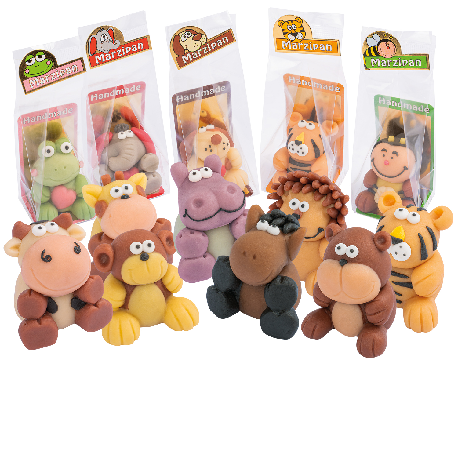 Marzipan Tiere im Cellophanbeutel. Elefant, Löwe, Zebra, Nilpferd, Bär, Frosch und Co. sind handgefertigt und einzeln verpackt. Sie eignen sich perfekt als kleine Aufmerksamkeit oder auch Tischdekoration für Partys.