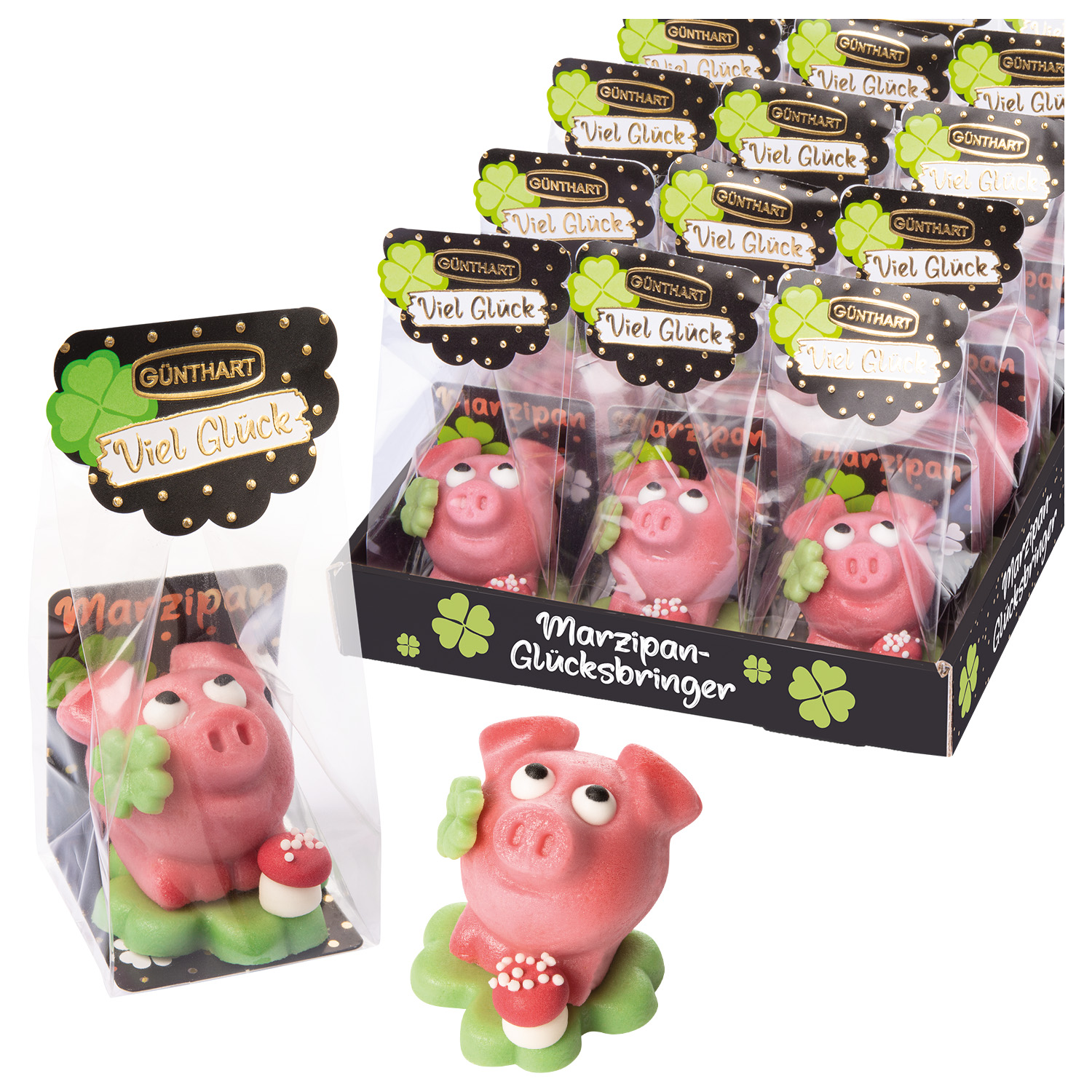 15 St. Marzipan-Schweinchen auf Kleeblatt im Cellophanbeutel