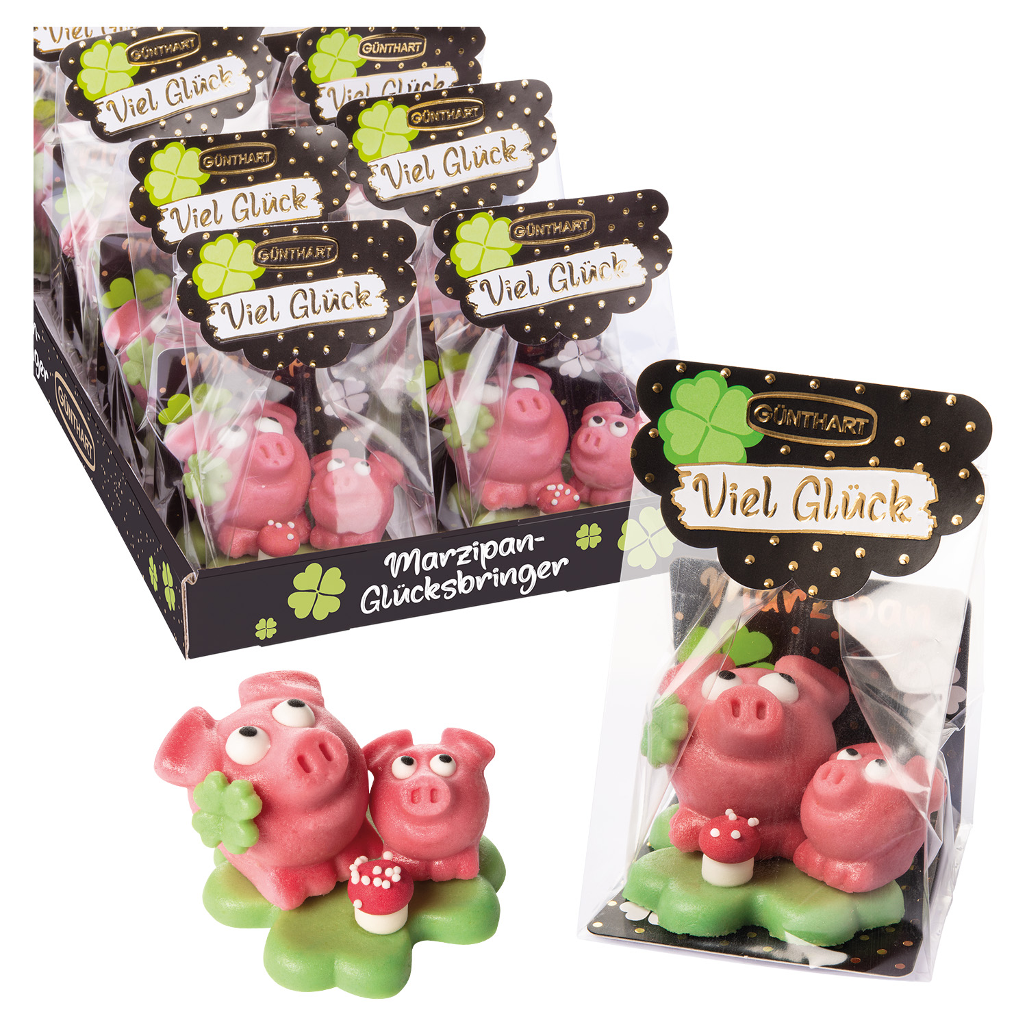 8 St. Marzipan-Schweinchen groß und klein auf Kleeblatt im Cellophanbeutel