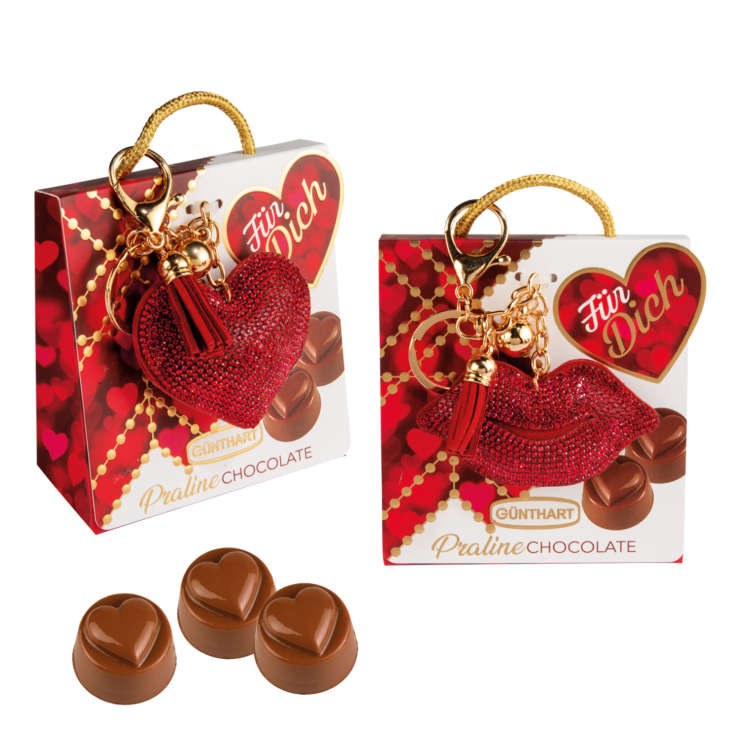 Pralinen: Vollmilchschokolade gefüllt mit Nougatcreme (43,5%).