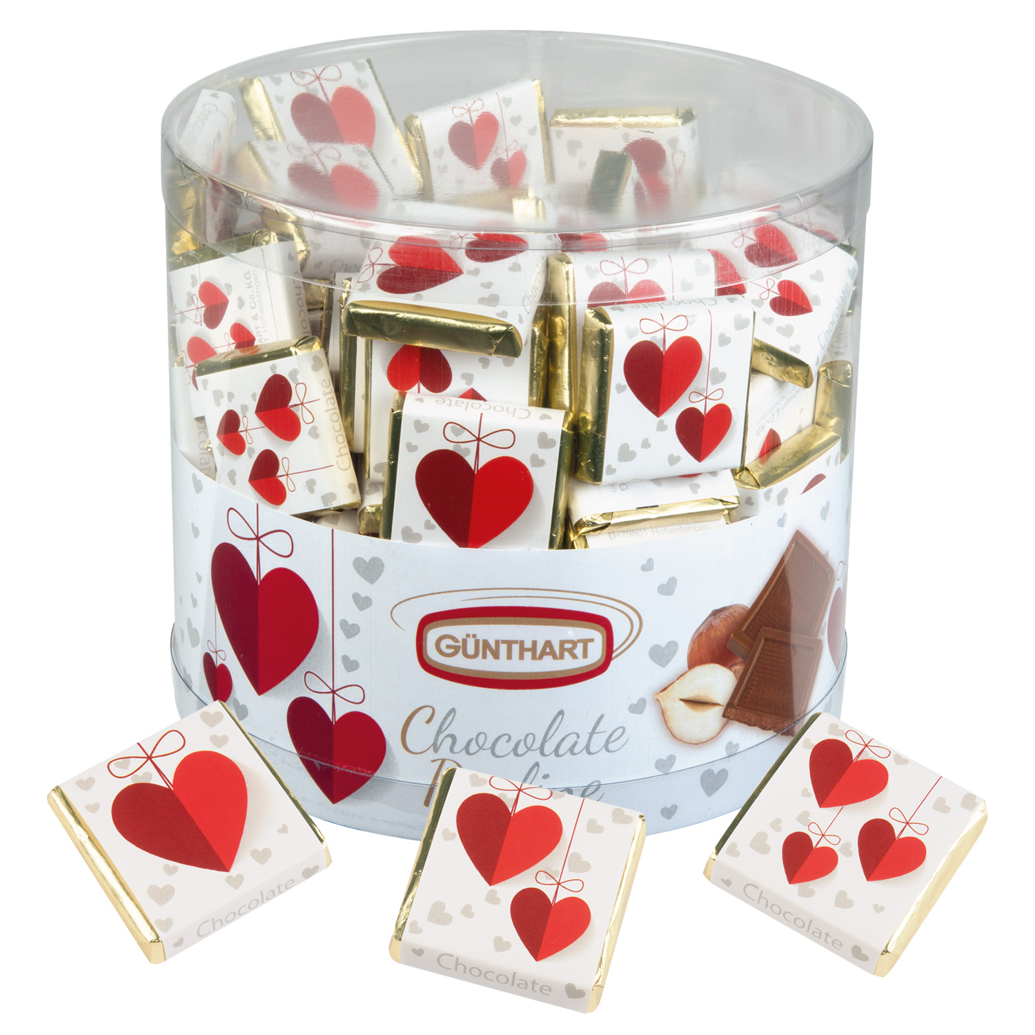 Vollmilchschokoladen-Täfelchen mit Nougatcreme-Füllung (Napolitains) mit kleinen und großen Herzchen auf dem Einwickler, die sich ideal für die kleine Nascheinheit zum Kaffee eignen. Lieferung in praktischer Runddose.Hinweis: Bitte beachten Sie, dass bei Temperaturen über 25 Grad der Versand von Schokoladenprodukten aus Qualitätsgründen nicht möglich ist. Im Einzelfall werden wir entscheiden, ob die Ware versendet werden kann.
