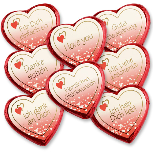 Die Pralinenherzen besitzen einen rot glänzenden Einwickler und mit 4 verschiedenen Sprüchen. In einem Set ist jedes Sprücheherz 10x vertreten. Das Pralinenherz ist mit einer zarten Nougatcreme gefüllt und von feiner Vollmilch-Schokolade umhüllt. Hinweis: Bitte beachten Sie, dass bei Temperaturen über 25 Grad der Versand von Schokoladenprodukte aus Qualitätsgründen nicht möglich ist. Im Einzelfall werden wir entscheiden, ob die Ware versendet werden kann.