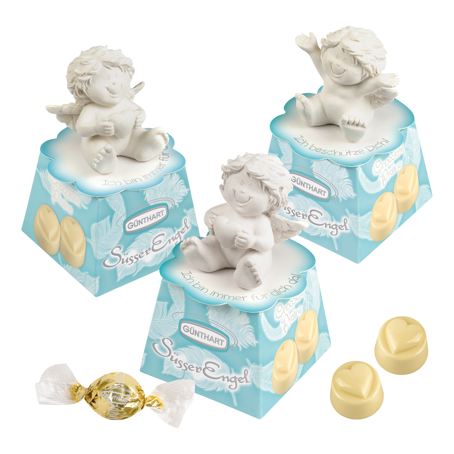 12 St. Polyresin-Engel auf Box, sortiert, mit weißen Pralinen