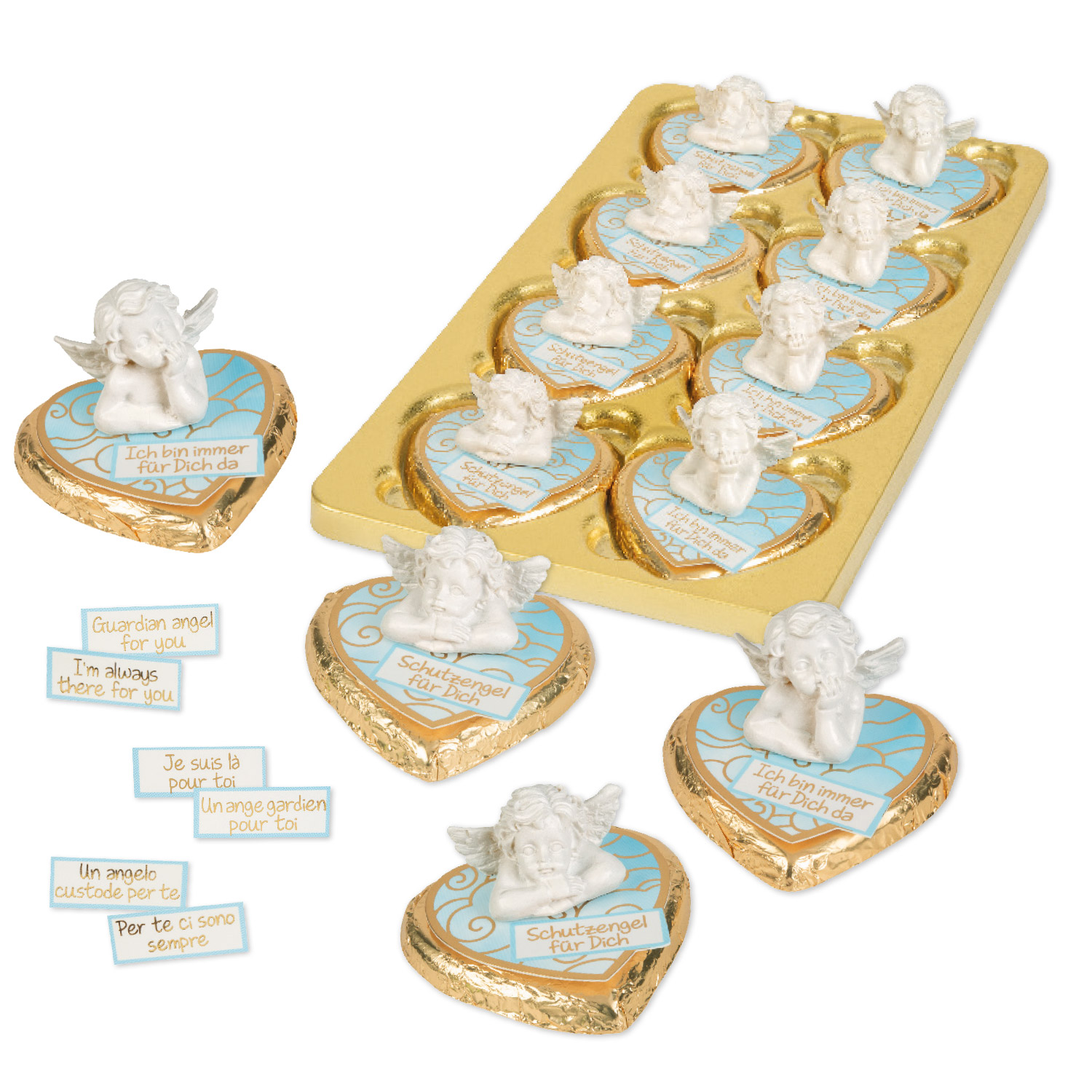 Pralinen: Vollmilchschokolade gefüllt mit Nougatcreme (43,5%).