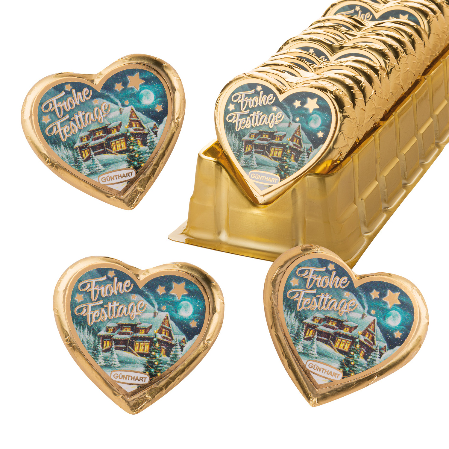 Die großen Pralinenherzen glänzen in ihrem goldenen Einwickler. Sie tragen einen schönes Kartonherz mit weihnachtlichem Aufdruck und dem Schriftzug: Frohe Festtage.