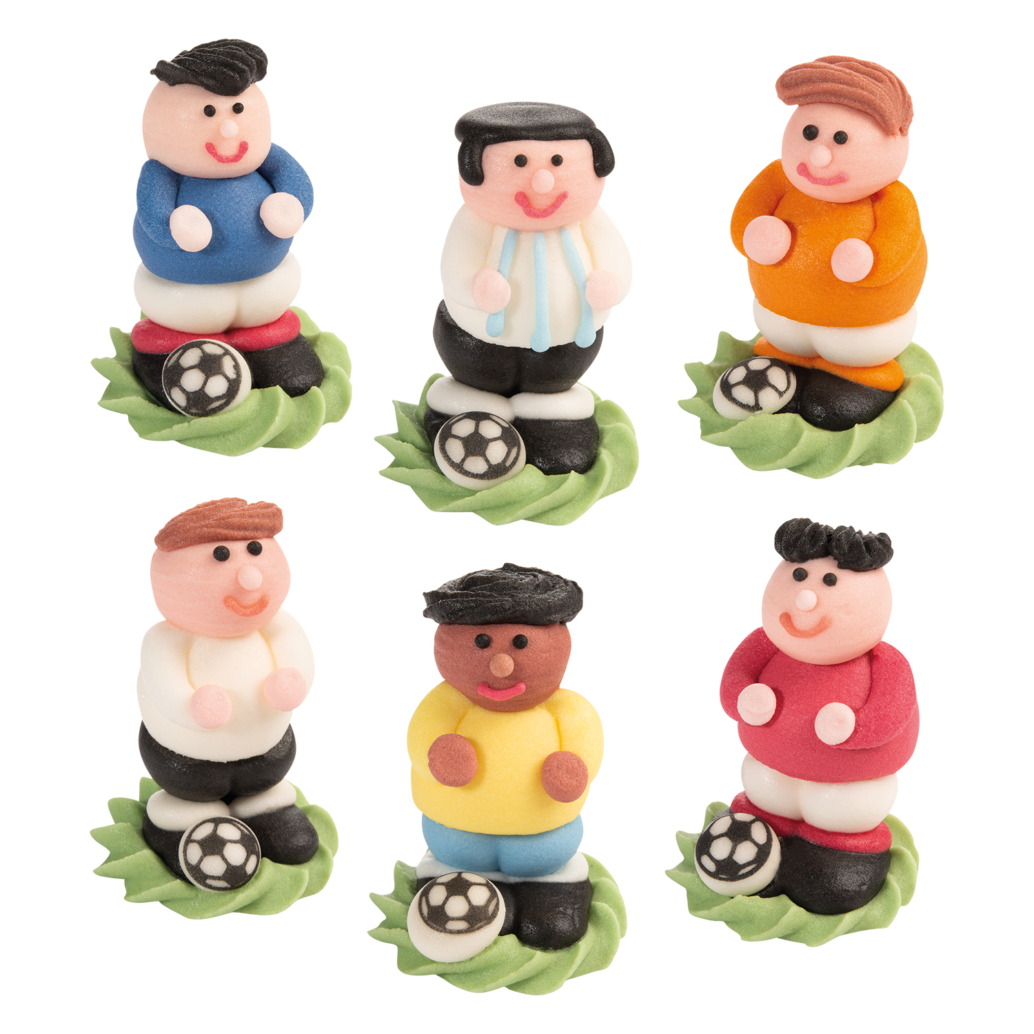 Fußballfans aufgepasst! 3D Zucker Fußballer in 6 verschiedenen Varianten als Torten- Muffin oder Kuchendekor für Sport- oder Vereinsveranstaltungen. Sie haben verschiedene Haarfarben und Trikots und lassen sich somit einfach kombinieren.