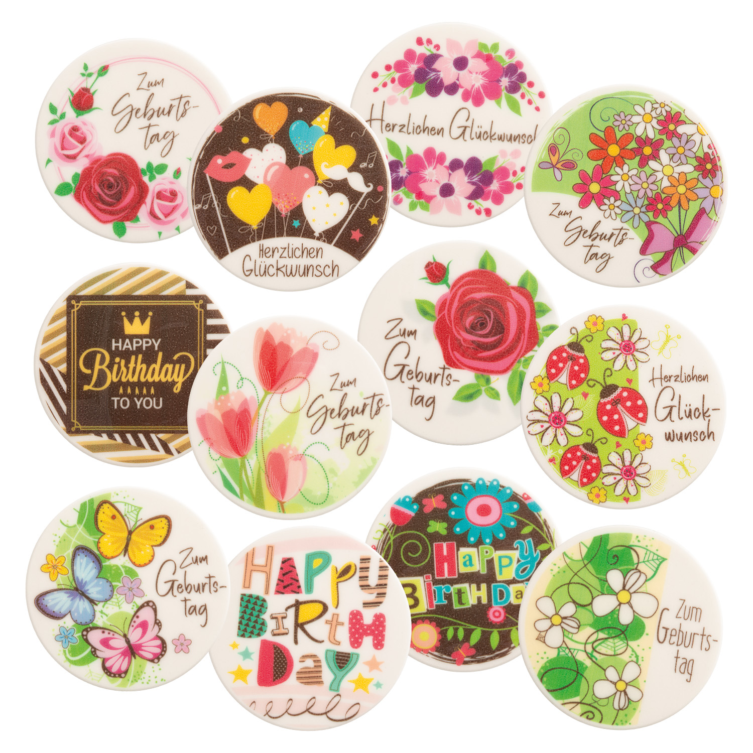 12 runde Dekor-Schilder zum Verzieren von Kuchen und Torten.