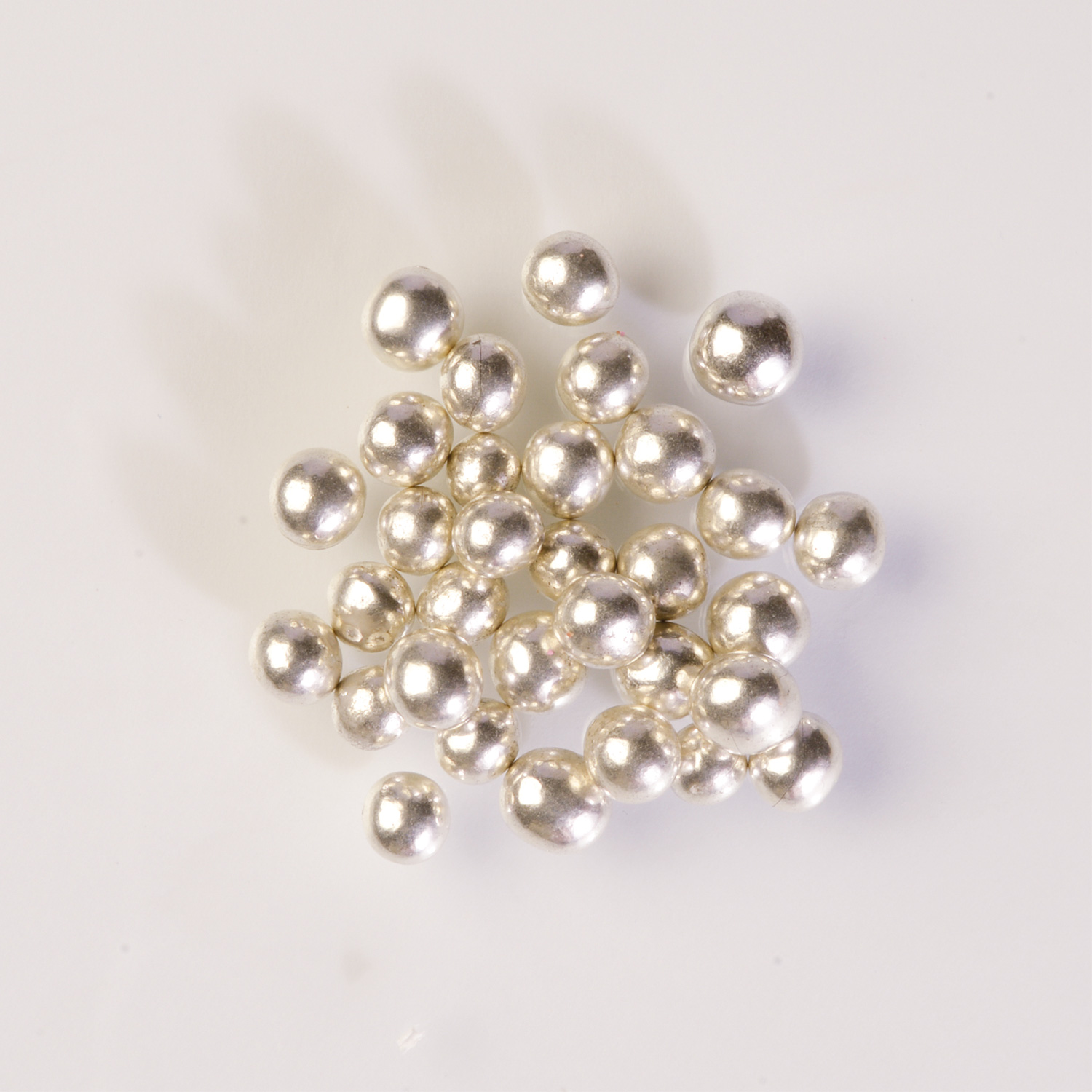 Silberperlen mit Schokolade als Füllung und einem glänzenden Überzug. Dadurch sind diese Silberperlen nicht so hart wie gegenüber einen Zuckerperlen.