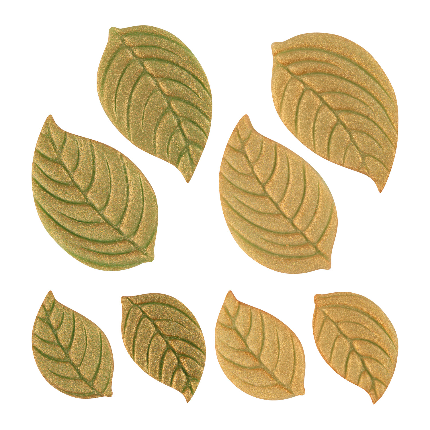 Wunderschöne dekorative hell- und dunkelgrüne Blätter in groß und klein. Sie lassen sich ausgezeichnet mit Marzipan-Rosen oder andere Blumen wird Ihre Torte zum Hingucker schlechthin.